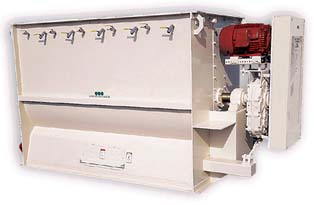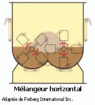 Les mélangeurs horizontaux sont très énergivores, mais ils détruisent suffisamment les mottes et les boulettes. De plus, ils sont robustes, simples et faciles d'entretien. Cependant, le volume de la cuve n'est utilisé qu'à environ 50 %.