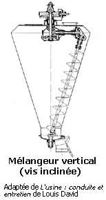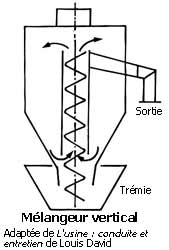 Les mélangeurs verticaux sont constitués d'une vis sans fin (verticale ou inclinée) et d'une trémie. Habituellement, cette trémie est située dans le bas de la vis. Le principe des mélangeurs verticaux est fort simple. Les ingrédients introduits dans le mélangeur remontent par la vis et redescendent dans la trémie où ils sont remontés continuellement. Le cycle se poursuit jusqu'à ce que le mélange soit adéquat. Par la suite, le produit fini est évacué en ouvrant la trappe du conduit d'expulsion. Les mélangeurs verticaux sont utilisés à plus de 90 % de leur capacité volumétrique contrairement aux mélangeurs horizontaux (50%). Cependant, la cadence de ce type de mélangeurs est lente, nécessitant entre 15 et 30 minutes par tonne.