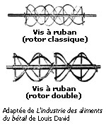 Les mélangeurs horizontaux sont constitués d'une grande cuve à fond arrondi dans laquelle tourne une ou deux vis centrales. Ces vis peuvent être munies de palettes métalliques ou peuvent être constituées d'un ou plusieurs rubans métalliques hélicoïdaux.
