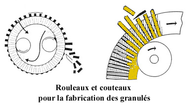 Finalement, lorsque les aliments sortent par les trous de la matrice, ils doivent être coupés par les couteaux (fixes ou tournants). Leur réglage détermine la longueur constante des granulés. Les granulés ont environ la longueur de la distance entre la filière et les couteaux. Habituellement, il y a deux couteaux pour une presse à deux rouleaux. Les couteaux doivent travailler de façon symétrique et similaire. Si l'un des couteaux travaille plus rapidement que l'autre, les granulés ne seront pas identiques.