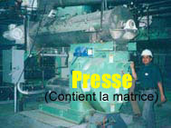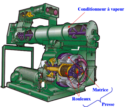 À la sortie du conditionneur, les aliments sont directement introduits dans les presses. Les presses sont les appareils qui permettent la compression des aliments moulus, formant ainsi les granulés. Il existe plusieurs types de presses, mais les plus utilisées dans les meuneries sont les presses à filières (avec matrice). Toutes les presses possèdent les mêmes organes principaux, soit la filière (matrice), les rouleaux et les couteaux.