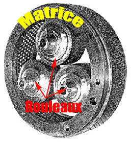 La matrice est une pièce métallique percée de trous par lesquels sort un aggloméré filiforme qui est coupé en granulés de dimensions identiques. Des alliages spéciaux de métaux sont nécessaires pour obtenir une filière durable, fiable et résistante aux pressions et à la corrosion. Le débit d'une presse dépend grandement de cette filière et de ses caractéristiques. Le diamétre intérieur et extérieur, et l'épaisseur de la matrice, la dimension et l'inclinaison des trous, le nombre de trous, et la nature des aliments sont les principaux facteurs qui influencent le débit et le rendement de la presse.