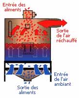 Il existe plusieurs types de refroidisseurs, mais le plus courant est le refroidisseur statique vertical. Les granulés entrent dans l'appareil par le dessus du refroidisseur, tandis que l'air ambiant pénètre par le dessous de l'appareil. Un grand déplacement de cet air ambiant sèche et refroidit les granulés. Un ventilateur, placé sur le dessus ou sur l'un des côtés de l'appareil, expulse l'air réchauffé vers l'extérieur. Les comprimés séchés et refroidis sortent du refroidisseur par le dessous. |