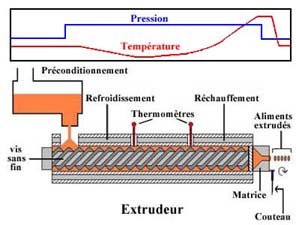 Le procédé d'extrusion consiste à faire passer un ingrédient ou un mélange d'ingrédients, hydratés ou non, à travers une matrice à l'aide d'une vis contenue dans un cylindre et ce, en présence d'une température élevée. Cette température est obtenue par simple friction lors de l'extrusion par voie sèche ou par injection de vapeur d'eau (conditionnement) lors de l'extrusion par voie humide.