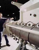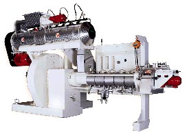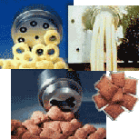 La pression à l'intérieur de l'extrudeur est plus élevée que la pression atmosphérique. La combinaison de la chaleur et de la pression permet une plus grande gélatinisation de l'amidon ce qui en augmente sa digestibilité. À la sortie de l'appareil, avec la diminution de la pression, les ingrédients gonflent. Ce gonflement est aussi causé par l'évaporation de l'eau des cellules et par l'explosion des cellules végétales. Finalement, les ingrédients sont coupés mécaniquement selon les dimensions et les formes désirées. |