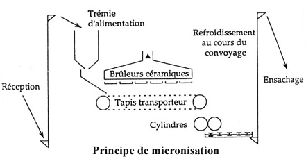 La micronisation est un traitement qui consiste à exposer les grains à des rayons infra-rouges émis par des plaques de céramique chauffées. Ces grains circulent en monocouche sur un tapis convoyeur situé sous les plaques de céramique. La micronisation est surtout utilisée pour accroître le contenu en protéines non dégradables dans le soya.
