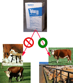 ![]() Tylan 10 (prémélange antibiotique) est utilisé pour les bovins de boucherie mais contre-indiqué pour les animaux en lactation |