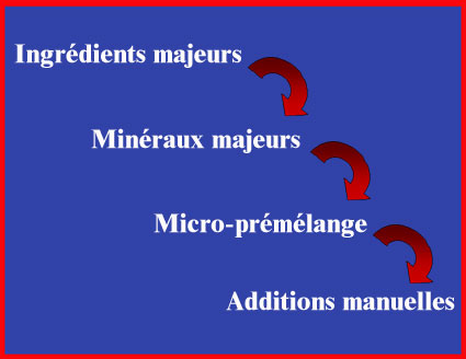 L'ordre d'incorporation des ingrédients dans la trémie de la balance n'est pas le même d'une meunerie à l'autre. Cependant, le principe est assez similaire. Tout d'abord, on ajoute les ingrédients majeurs (grains moulus, tourteaux, son, etc.). Ensuite, les minéraux majeurs sont incorporés. Finalement, les micro-prémélanges et les additions manuelles (médicaments et autres additifs) peuvent être ajoutés dans la trémie ou dans le mélangeur.