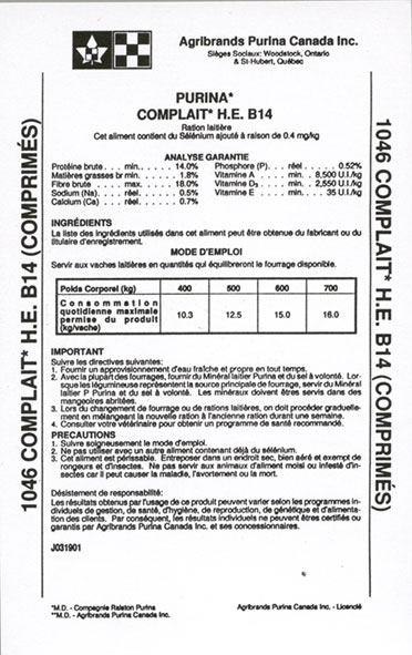 Par la suite, les aliments peuvent être ensachés ou livrés en vrac (par camion ou par train). Lors de l'étape de l'ensachage et du chargement du vrac dans les camions, les produits finis sont pesés afin d'obtenir un contrôle rigoureux des quantités expédiées. Les erreurs dans les quantités se traduisent par des réclamations des clients (poids faible), des pertes monétaires (poids élevé) et une perte de confiance des clients (poids irrégulier). Il est donc important de vérifier les balances, les dimensions des sacs et la cadence des pesées afin de conserver un poids constant et de satisfaire les exigences des clients. De plus, en conformité avec la loi Canadienne sur les aliments du bétail, chaque lot expédié doit être identifié par le biais d'une étiquette. Celle-ci comprend plusieurs informations qui varient selon la nature du produit. |